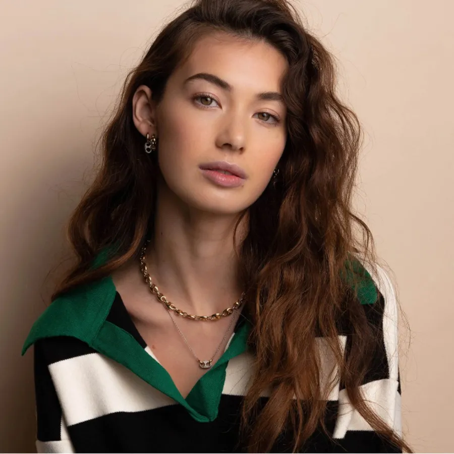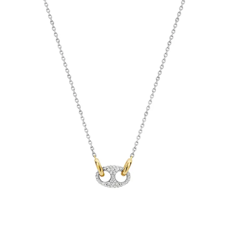 Este colar TI SENTO exibe um berloque em forma de grão de café revestido com zircónias em cravação pavé. A peça é toda em prata com banho de ródio e com o pormenor das argolas com banho de ouro de 18k. O comprimento do colar é de 38cm e tem uma extensão de 10cm, criando a possibilidade de o usar com diferentes comprimentos.