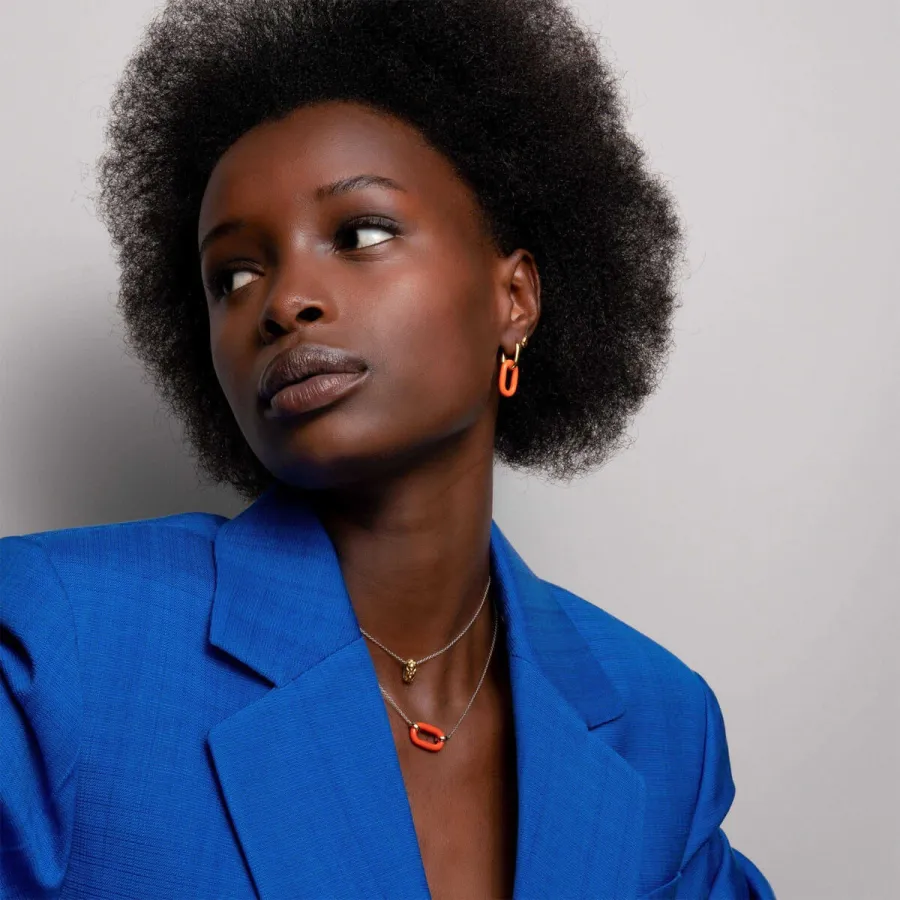 Um modelo clássico da Ti Sento desta vez em laranja. Os brincos são de prata com banho de ouro de 18k. Perfeitos para levar um bocadinho de calor e energia positiva a uma festa ou mesmo para o escritório.