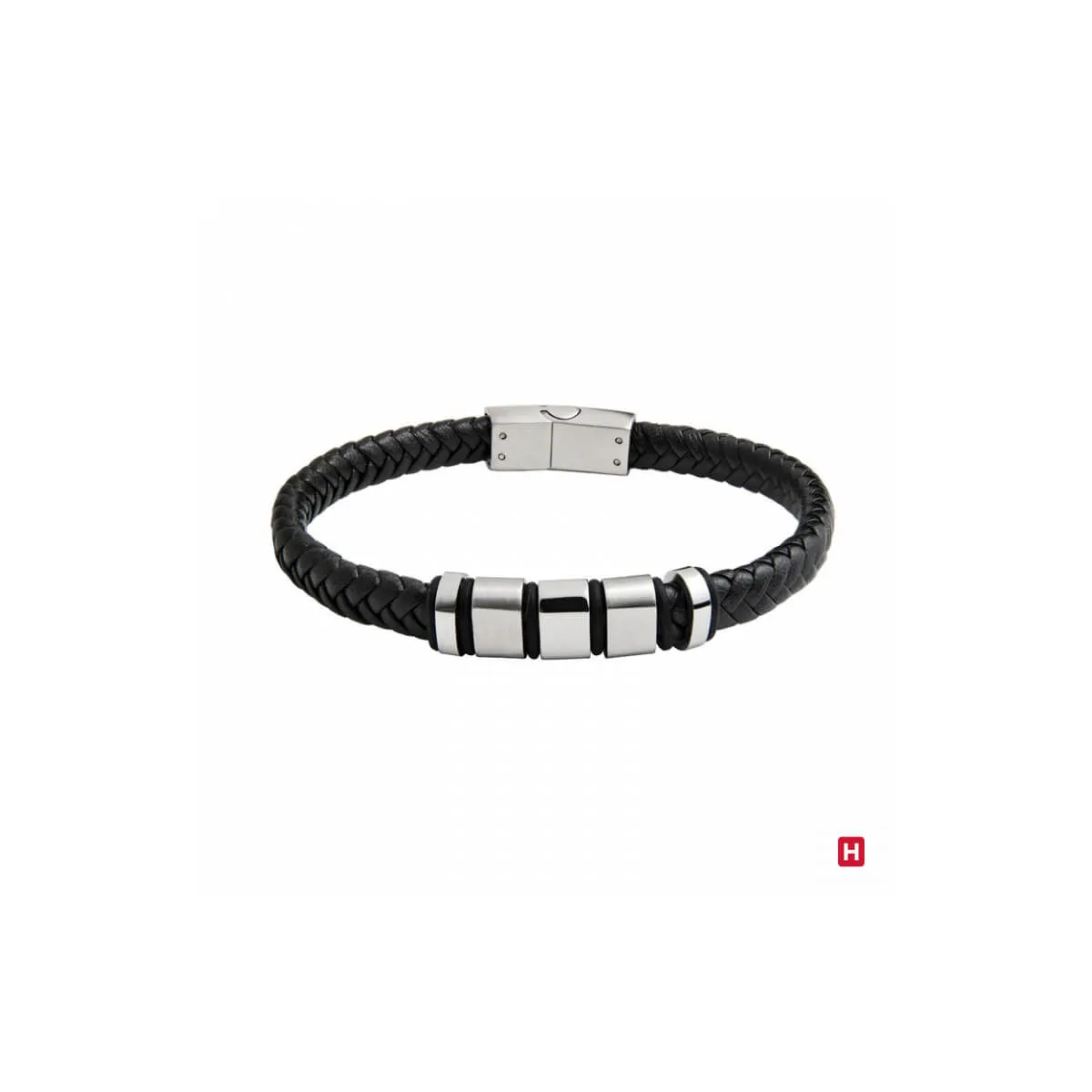 Pulseira em pele entrançada preta com fecho e aplicações em aço 316L. Personalizável.