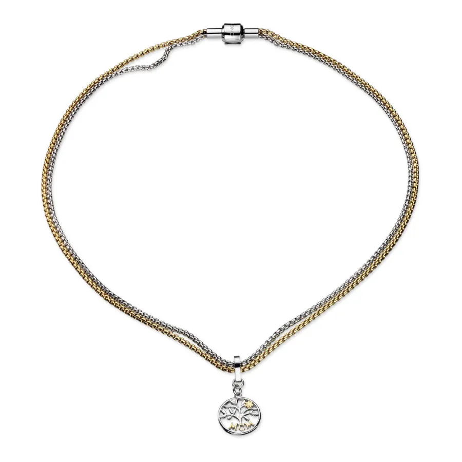 A ONE apresenta o Set Colar & Charme ONE Energy Mummy criado com muito amor e cuidado para homenagear todas as mães do mundo, especialmente para este Dia da Mãe. O colar é composto por dois fios - um dourado e um prateado - que quando combinados, apresentam um design elegante e sofisticado. O charme, por sua vez, é um círculo prateado, que contém uma árvore no interior. A árvore da vida que simboliza a família, as gerações, e representa o amor e o cuidado que uma mãe tem pelos seus filhos. No charme, lê-se a palavra "Mom", que demonstra todo o carinho e gratidão que sentimos pelas nossas mães, com um pequeno detalhe de uma flor em dourado, trazendo um toque de delicadeza e feminilidade ao conjunto. Uma opção versátil que pode ser usada em conjunto ou de forma independente e combina perfeitamente com outras peças ONE, permitindo criar um look personalizado e exclusivo.