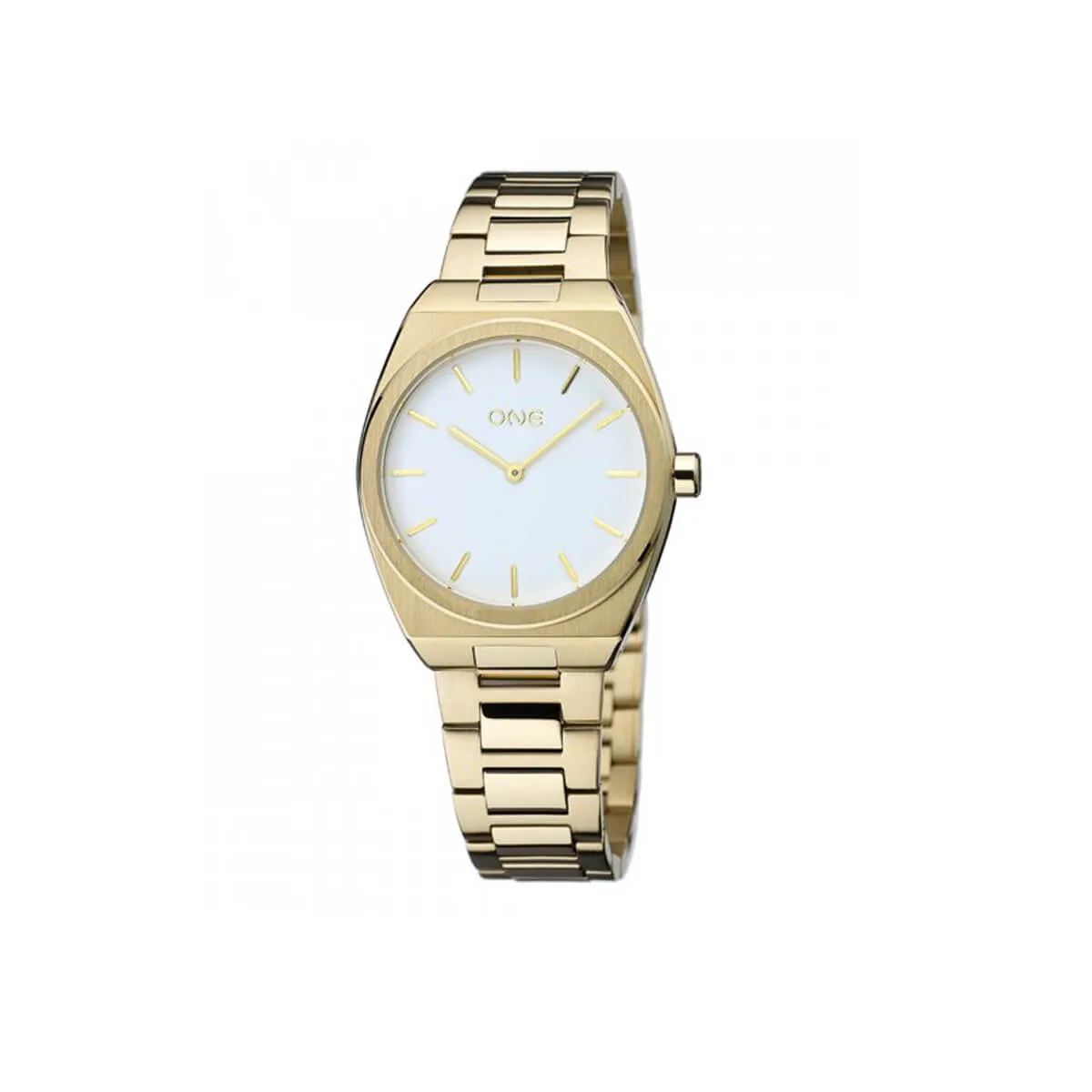 Relógio One Downtown dourado com bracelete de elos dourada. Mostrador pequeno em que os indexes funcionam como uma extensão dos ponteiros, este é um relógio de linhas simples e andrógenas. É um relógio analógico que indica horas e minutos.