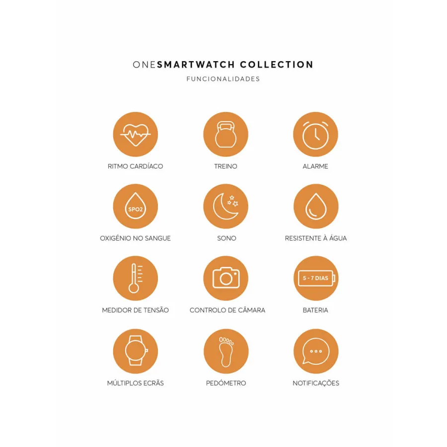 Funções: Hora, Calendário, Alarme, Ritmo Cardíaco, Treino, Notificações, Oxigénio no sangue, Sono, Resistente à água, Pedómetro, Medidor de Tensão, Controlo da Câmara, Múltiplos Ecrãs, Bateria até 5 dias