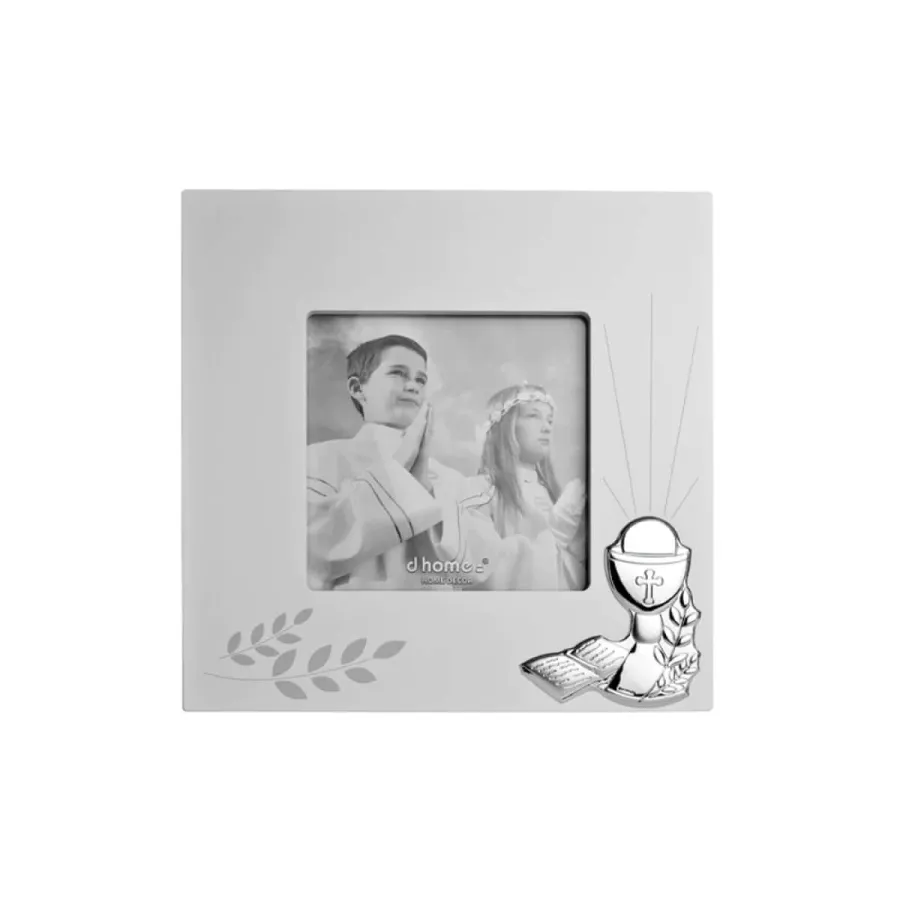 Moldura em madeira branca com detalhes alusivos à Primeira Comunhão. Aplicação em formato de Cálice em prata bilaminada.