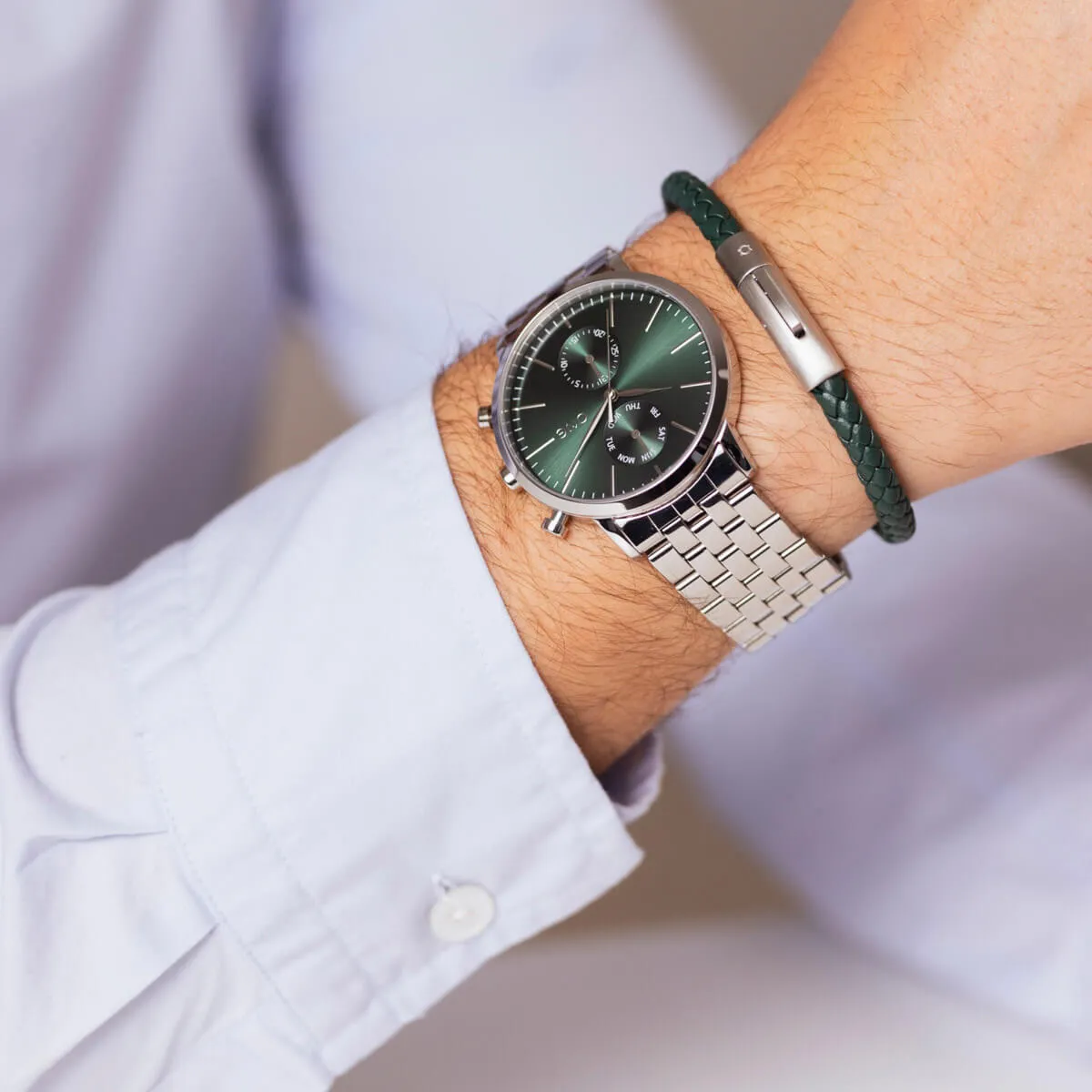 O relógio analógico Elite é uma peça robusta, moderna e contemporânea. Com um mostrador redondo e de fundo verde, sobressaem os três ponteiros e indexes prateados, no mesmo tom que a bracelete de elos em aço inoxidável . O relógio Elite conta ainda com multifunções: indicação dos dias da semana na parte superior do mostrador e dos dias do mês na parte inferior. Resistência à água de 5 ATM.