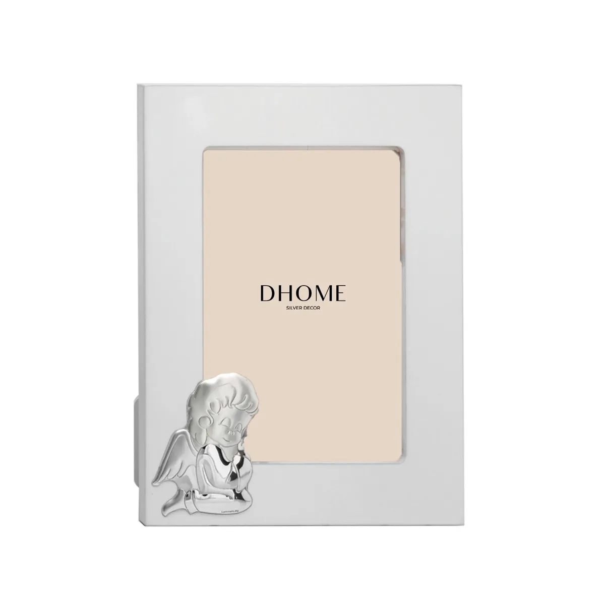 Moldura em madeira branca com anjo em prata bilaminada. Personalizável.
