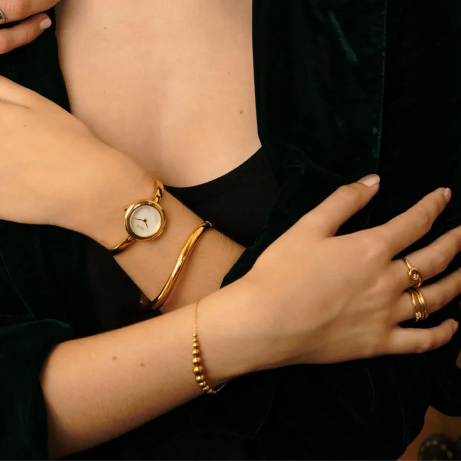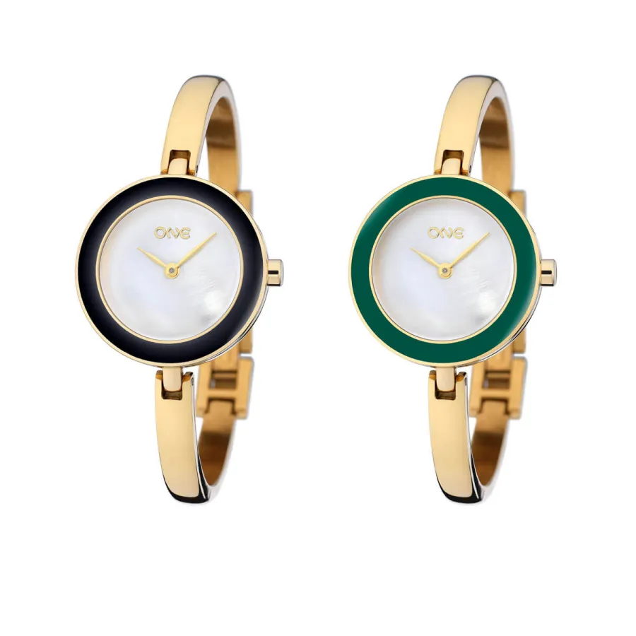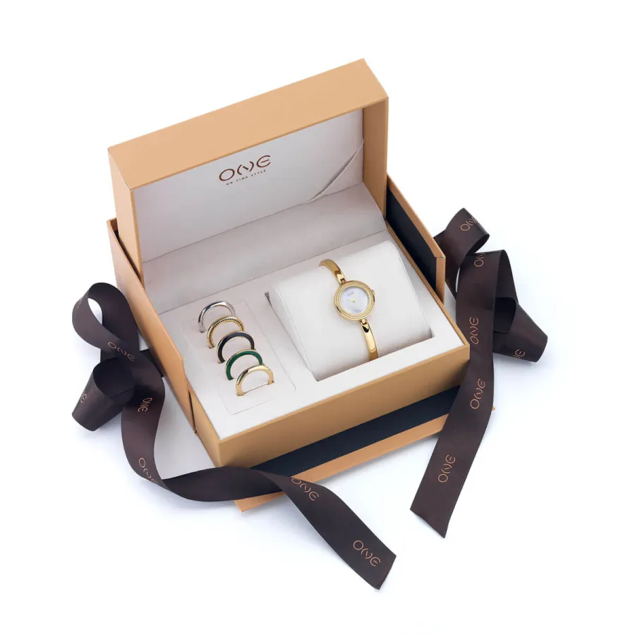 A Box Elegance foi criada em linha com a tendência crescente de caixas e mostradores mais pequenos e para homenagear um modelo clássico da relojoaria feminina. É composta por um relógio dourado, com uma caixa pequena e redonda, mostrador em madrepérola e dois ponteiros em dourado. A bracelete, também em dourado, tem um design minimalista parecendo uma pulseira no pulso. A box conta com seis opções diferentes de aros intercambiáveis que criam um look totalmente diferente ao relógio: em dourado com cristais brancos, em dourado com cristais pretos, totalmente dourado e totalmente prateado, em preto e em verde brilhante. Basta rodar a peça no topo da caixa do relógio para trocar o estilo do relógio para o dia. A Box Elegance é um verdadeiro 6 em 1 onde de um relógio nascem seis looks distintos, versáteis para qualquer que seja a ocasião, mais casual ou mais formal. A prenda perfeita para uma mulher que gosta de inovar os seus looks de forma rápida e fácil.