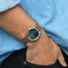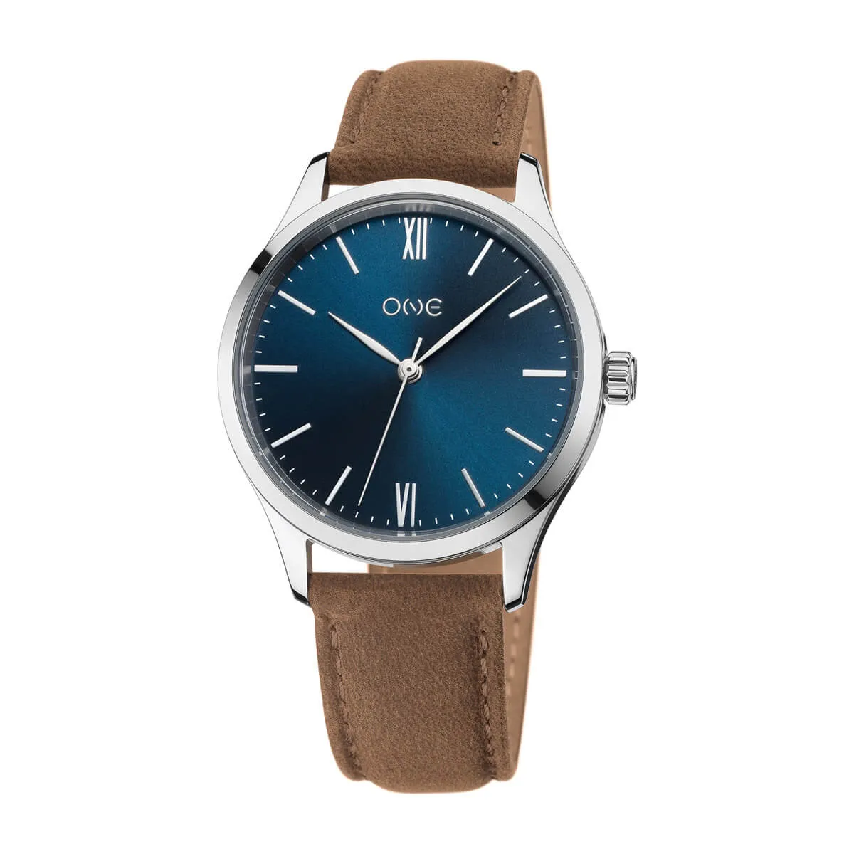 O relógio analógico Heritage azul é um relógio clássico masculino e que segue a tendência de caixas mais pequenas no pulso. Distingue-se pela sua bracelete em pele camurça castanha que contrasta com o mostrador azul-escuro dentro de uma caixa redonda, minimalista e prateada. Os três ponteiros (horas, minutos e segundos) são prateados assim como os indexes, com detalhe para a posição 12 e 6 que estão em numeração romana. Um relógio clássico, intemporal e que, fazendo jus ao seu nome, poderá ser passado de geração em geração.