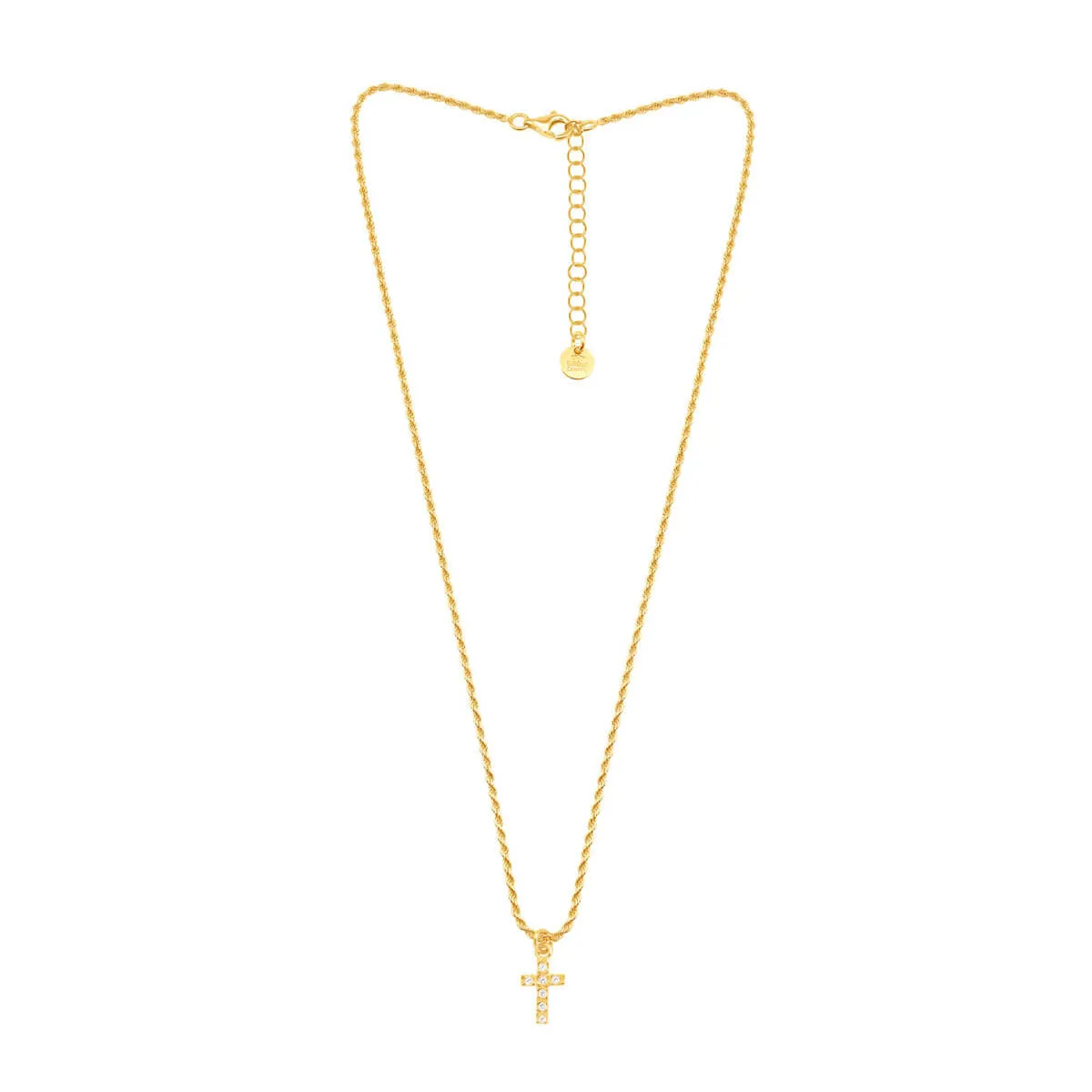 Colar Trust em prata de lei, banhado a ouro amarelo, com zircónia. Joia com pendente de cruz que representa a proteção, a fé e o pensamento positivo. Simples e elegante, ideal para a acompanhar todos os dias.