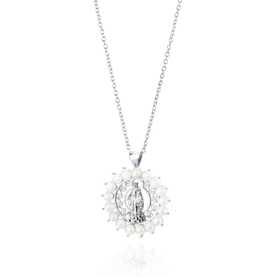 Colar em prata com banho de ródio, com medalha de Nossa Senhora das Graças.