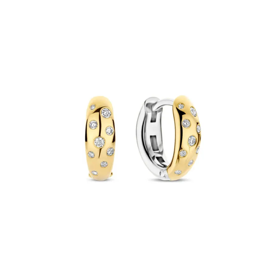 Os brincos de argola TI SENTO 78006ZY são um pequeno toque de magia celeste, inspirados no brilho dourado dos dias de verão. Fabricados em prata de lei 925 e banhados a ouro amarelo quente, estas argolas cintilam com um delicado salpico de zircónias cúbicas brancas como a luz do sol a refletir nas ondas do mar.Com um design versátil, adaptam-se perfeitamente do estilo casual diurno ao glamour das noites especiais. O fecho com dobradiça garante um uso seguro e confortável, permitindo que os uses com leveza do nascer ao pôr do sol.Hipoalergénicos e sem níquel, oferecem conforto luxuoso em cada utilização. Radiantes, delicados e cheios de elegância estes brincos dourados merecem lugar de destaque nos teus looks.
