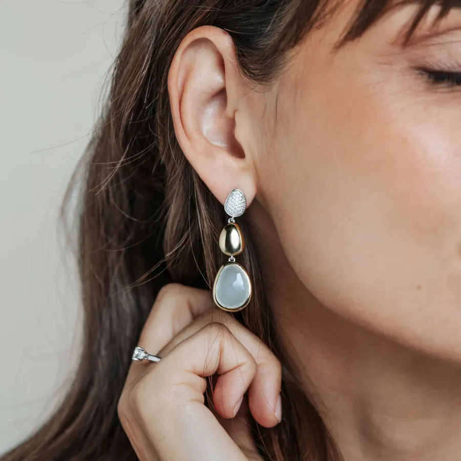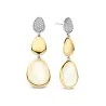 Brincos TI SENTO em prata 925 dourada com design triplo: topo pavé banhado a platina, elemento dourado polido e pedra branco-leitosa emoldurada para um brilho suave e elegante. Com movimento feminino e contraste sofisticado, elevam tanto looks diurnos como ocasiões especiais. Hipoalergénicos e leves, oferecem conforto e estilo com acabamento premium.