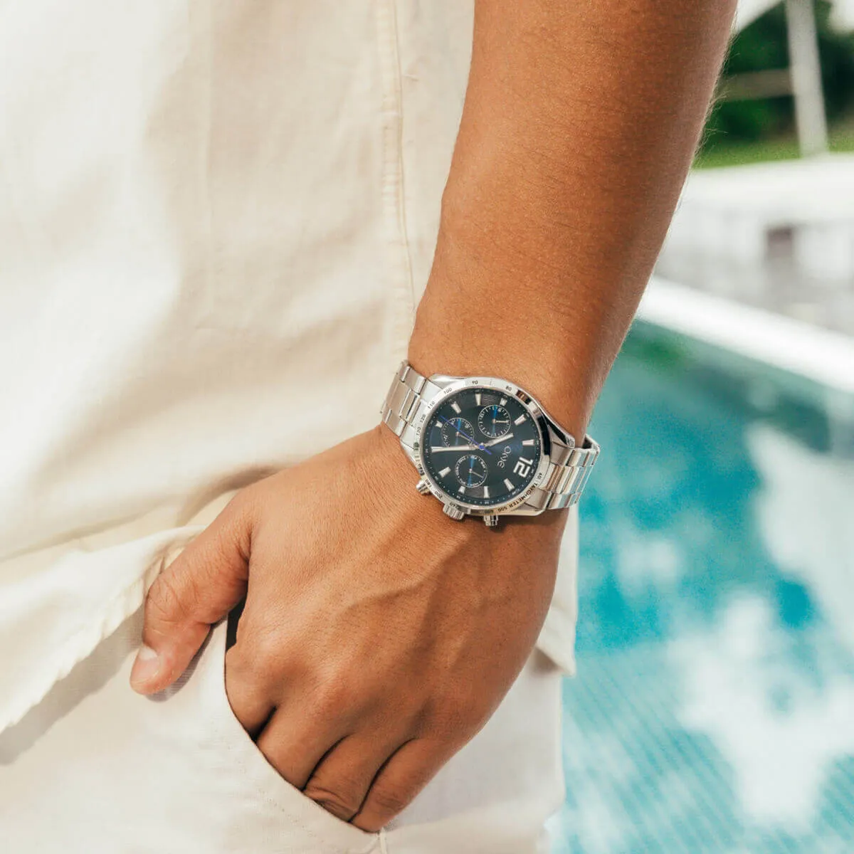 O relógio analógico Pulse é um modelo masculino que combina funcionalidade e design desportivo num só acessório. Com caixa e bracelete em aço inoxidável prateado, o destaque recai sobre o mostrador em azul escuro, que cria contraste com os indexes e ponteiros prateados. O ponteiro dos segundos surge em azul, conferindo um apontamento arrojado e desportivo à peça. O design integra três submostradores funcionais: um indicador de 24h, um mostrador de data e outro de dia da semana, oferecendo uma leitura completa e prática. A moldura exterior inclui um taquímetro, reforçando o caráter desportivo do modelo. Robusto e elegante, o Pulse conta ainda com resistência à água 5ATM, perfeito para o dia a dia de quem procura estilo aliado a funcionalidade.