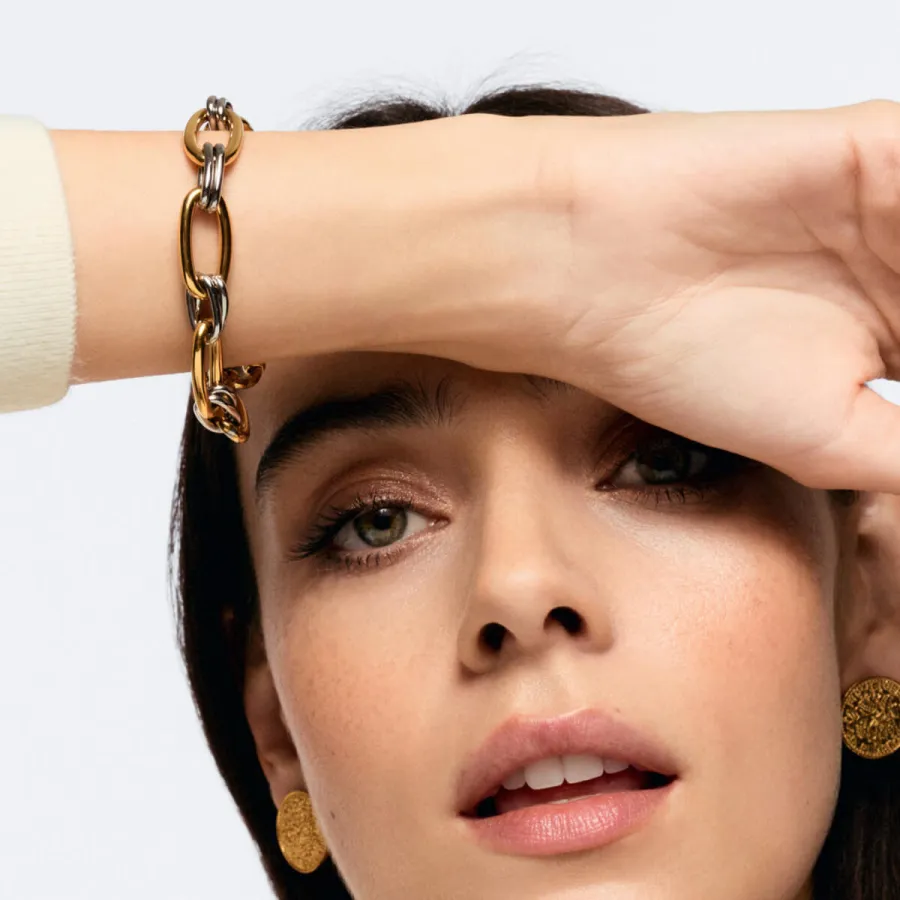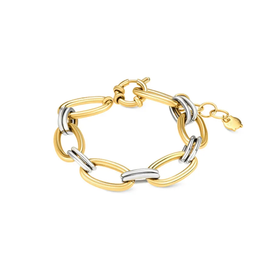 A pulseira Unity é uma peça de design marcante e moderno. Uma pulseira de elos que intercala elos ovais dourados de maior dimensão com elos duplos prateados mais pequenos, criando um contraste elegante e equilibrado entre os dois metais. Termina com um fecho redondo que acrescenta personalidade à peça. Ideal para os amantes do mix and match de metais, a Pulseira Unity é uma escolha versátil e cheia de estilo, perfeita para complementar qualquer look com um toque moderno e distinto.
