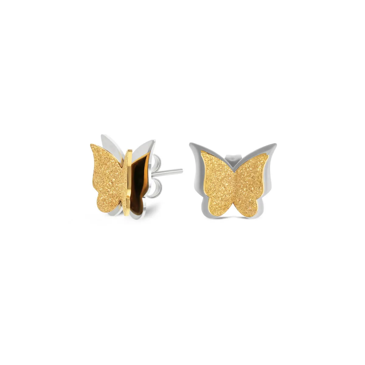 Os brincos Duo da coleção Butterfly são pequenos e combinam de forma muito subtil dourado e prateado. São compostos por duas camadas da mesma forma mais realista de uma borboleta, uma frontal mais pequena em dourado e com um toque extra de brilho e outra, ligeiramente maior, em prateado - dando o efeito de uma moldura na forma de borboleta. Os brincos são de espigão e terminam com um fecho em borboleta para maior conforto. Esta coleção One capta a beleza efémera das borboletas, uma fusão entre delicadeza e poder da Natureza.