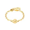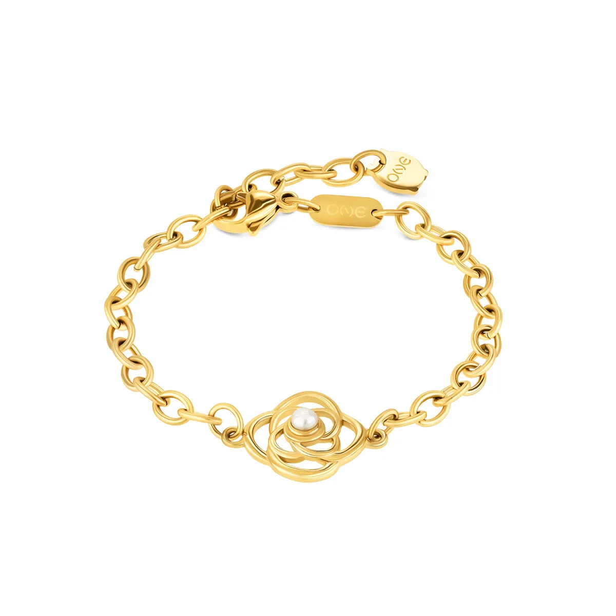 A pulseira Belle, da coleção Rose, coloca o elemento icónico da coleção em pleno destaque. Composta por uma malha de elos dourados redondos, delicadamente interligados entre si, esta pulseira apresenta no centro uma rosa de design minimalista, totalmente dourada, onde o olhar se concentra no coração da flor, uma pérola branca de água doce que acrescenta luminosidade e sofisticação. Elegante e feminina, é uma peça perfeita para combinar com outras da mesma coleção, seguindo a tendência de "stacking" no pulso. Termina com um fecho em mosquetão e elos extensores, permitindo ajustar o comprimento e garantir o encaixe ideal. A coleção Rose evoca a delicadeza e a graça de uma rosa, com as suas linhas em espiral entrelaçadas de forma leve e harmoniosa, parecendo flutuar sobre a pele.
