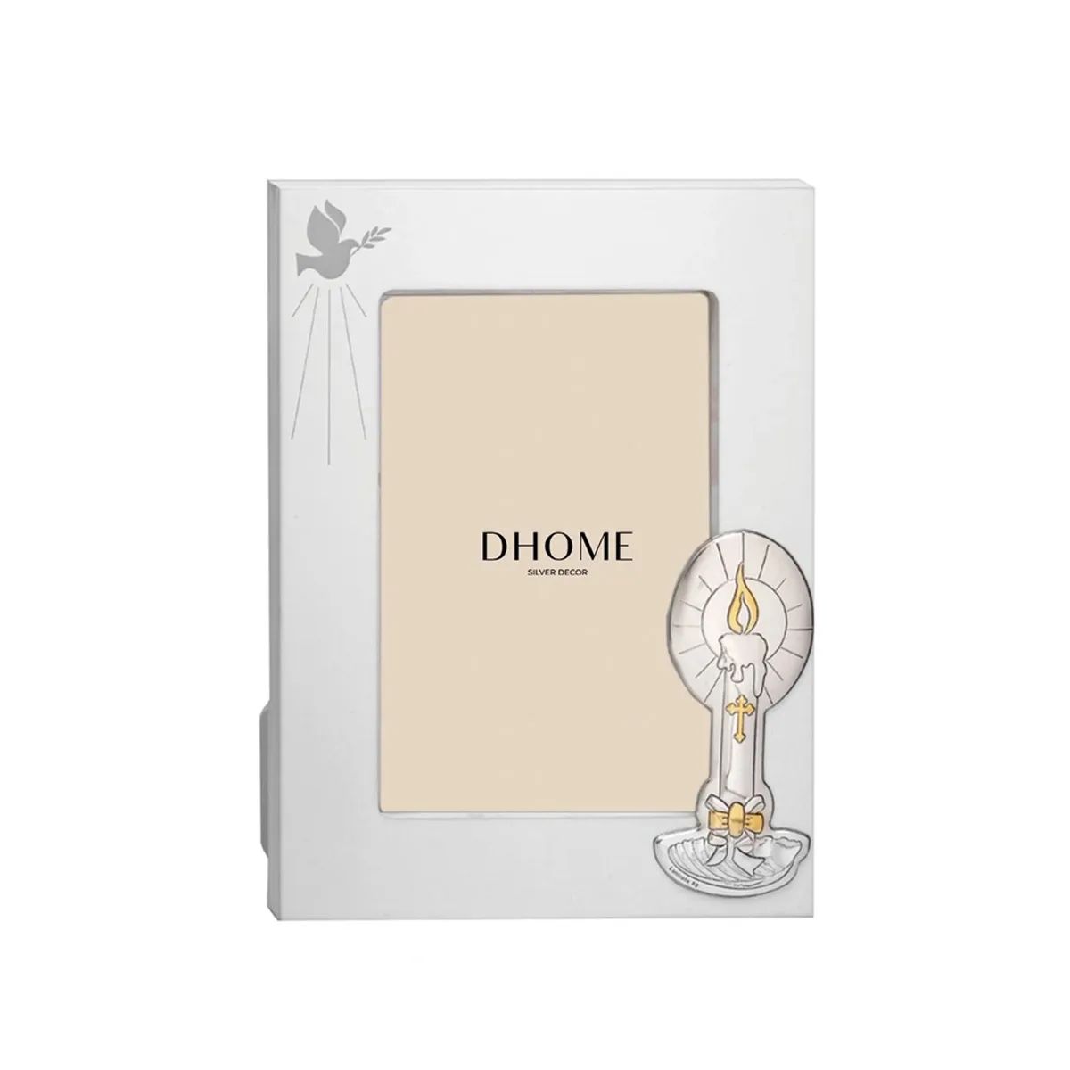 Moldura de batismo em madeira branca com vela em prata bilaminada.